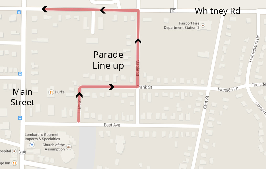 The parade line up starts on Hart St heading North. It continues to Maple St and ends on Whitney Rd. Please do not enter Maple St from Whitney Rd. There will be a lot of activity on the day of and it's best to take East Ave to Hart st.