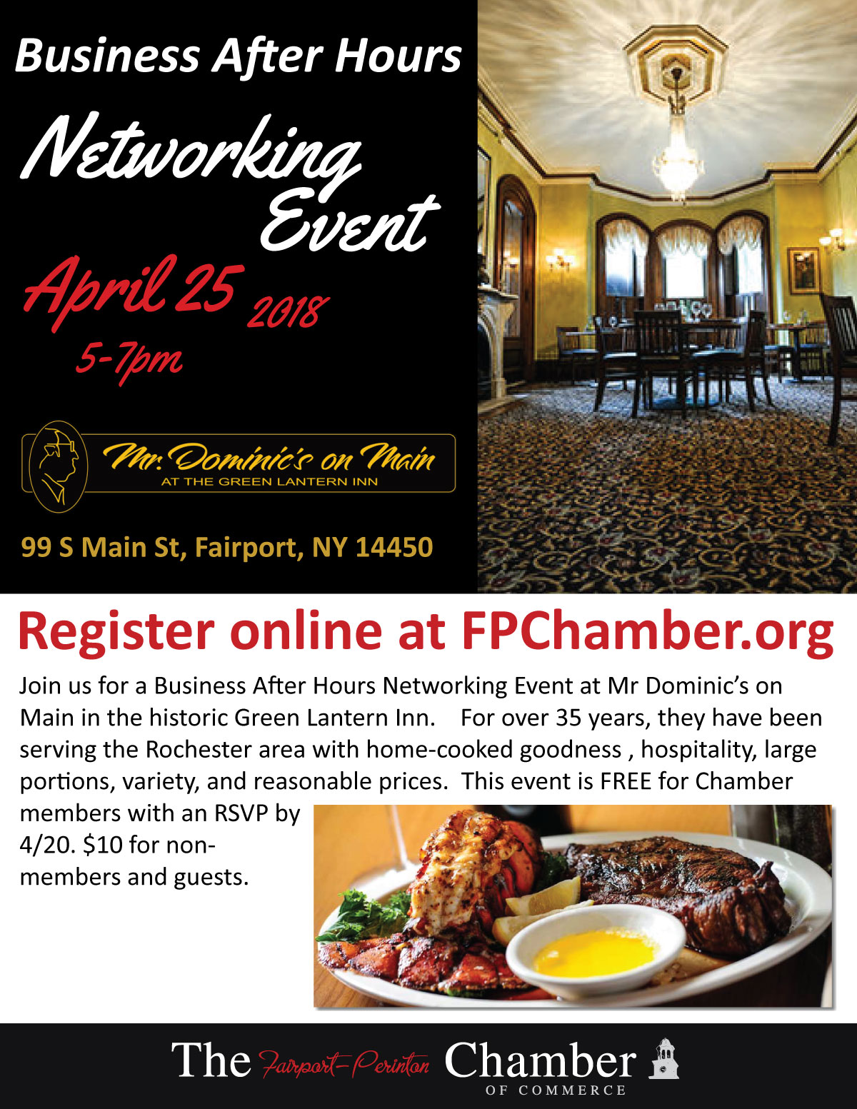 Join us for a Business After Hours networking event at Mr Dominic's on Main, in the historic Green Lantern Inn. For over 35 years, they have been serving the Rochester area with home-cooked goodness, hospitality, large portions, variety, and reasonable prices. This event is FREE for Chamber members with a RSVP by 4/20. $10 for non-members and guests.