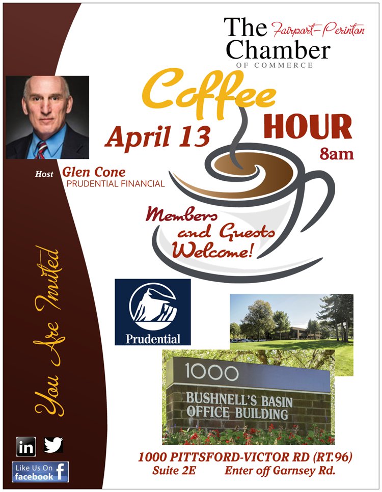You are invited to a coffee hour at hosted by Glenn Cone Prudential Insurance. Drop in to discuss what is going on at your business... and what the Chamber can do for you! The coffee is ready! We need your input!