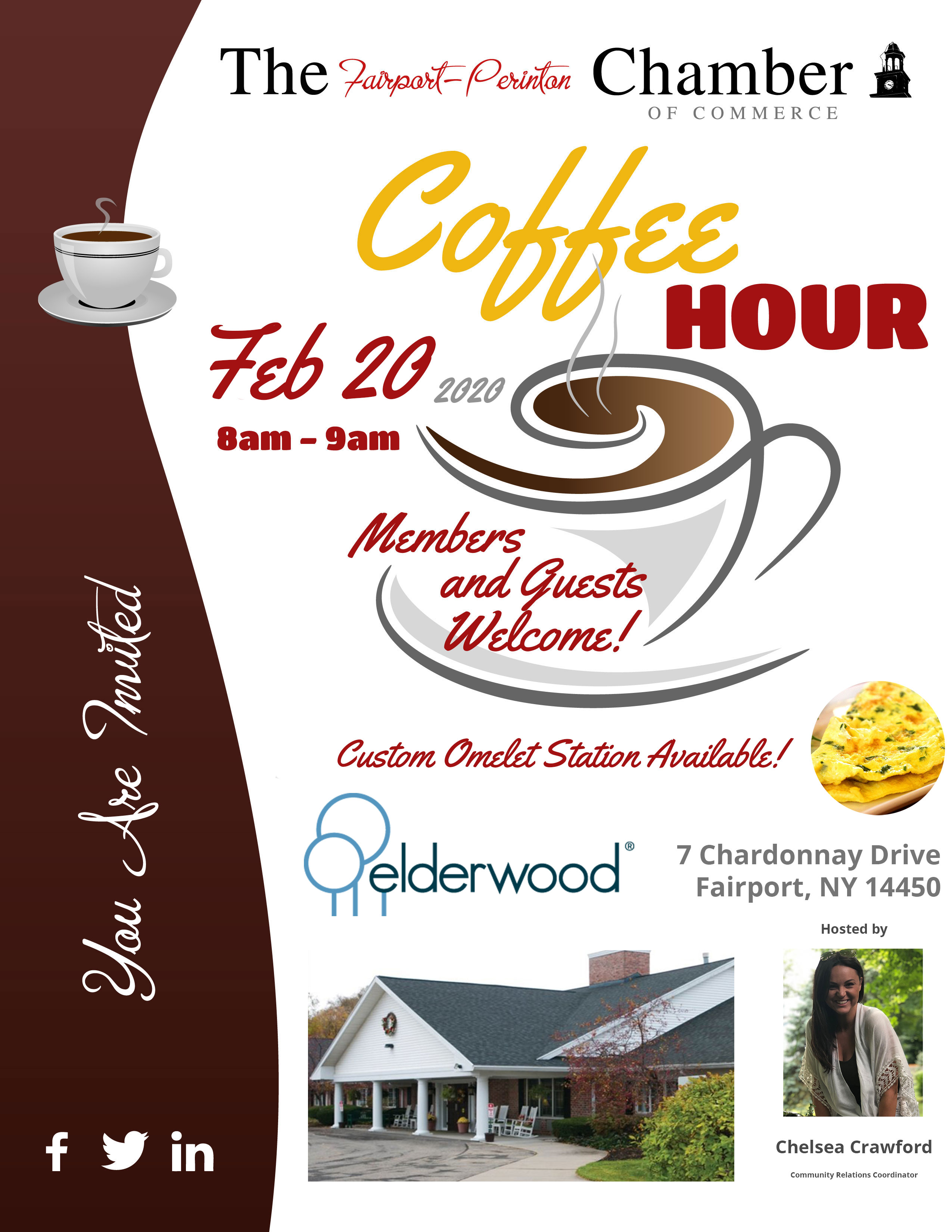 You are invited to a coffee hour at Elderwood Village at Fairport!  The event is hosted by Chelsea Crawford, Elderwood's Community Relations Coordinator,