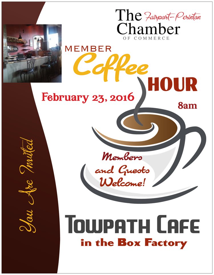 You are invited to a coffee hour at Towpath Cafe (6 N Main St. Fairport, NY 14450). Drop in to discuss what is going on at your business... and what the Chamber can do for you! The coffee is ready! We need your input! No registration required!