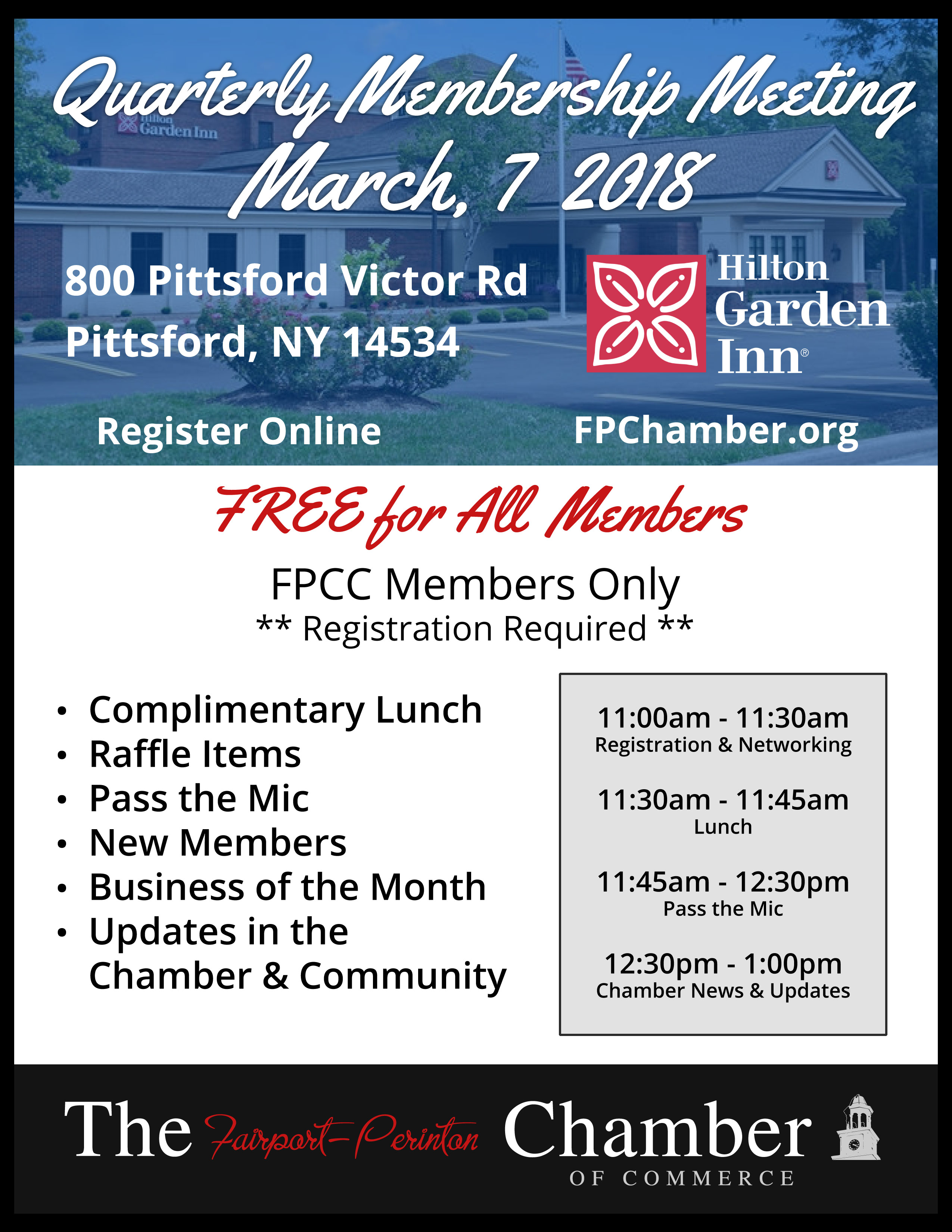 Chamber members are invited to our quarterly membership meeting on March, 7 2018 at The Hilton Garden Inn from 11:00am - 1:00pm. The event will include a complimentary lunch, raffle items, pass the mic, new member introductions, business of the month, updates on the Chamber, and a quick presentation on "10 Marketing Tips for Small Business" provided by Heather Jones of Just Solutions, Inc. This event is free for all members, but registration is required using the link provided. We look forward to seeing you at the Hilton Garden Inn!