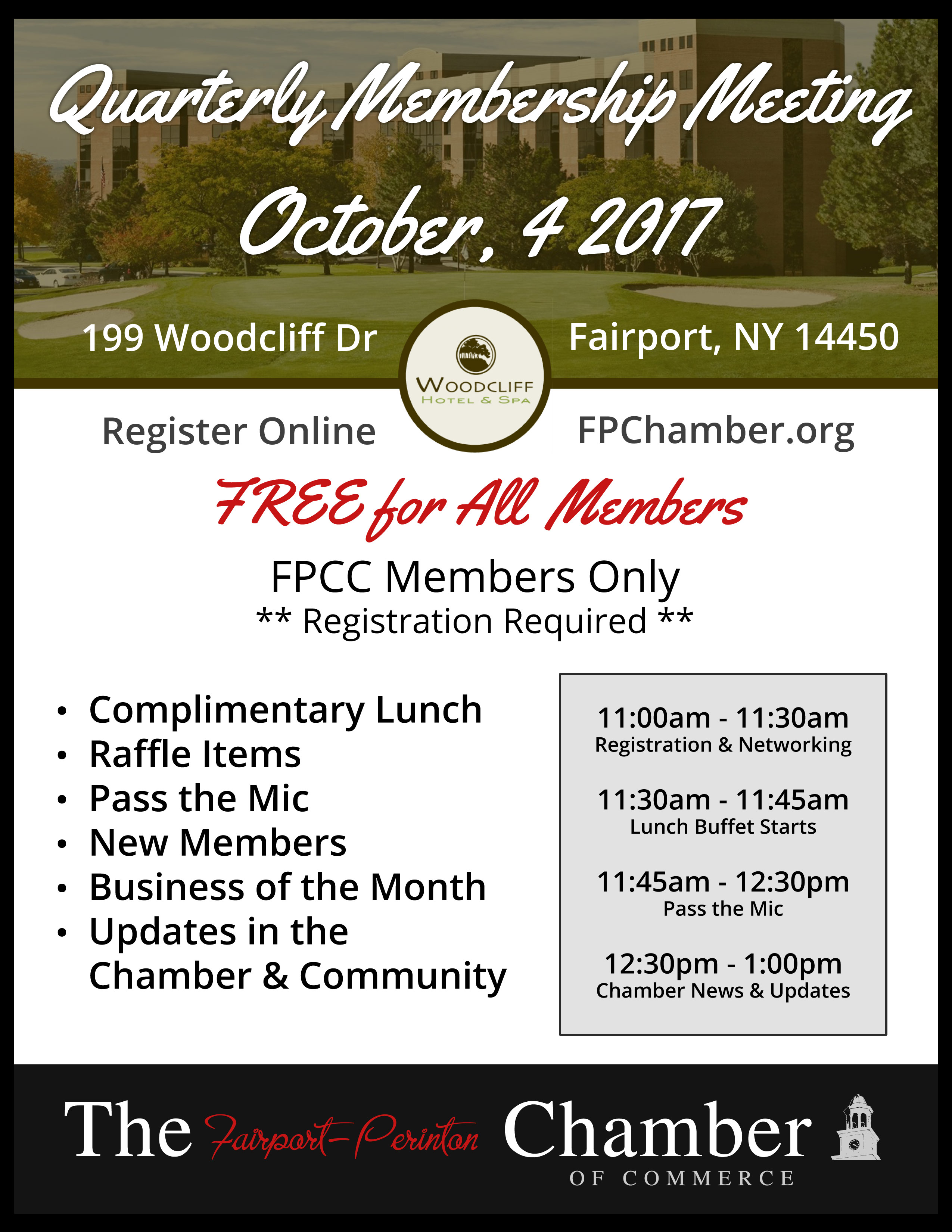 Our quarterly membership meeting will take place on October 4, 2017 at Woodcliff Hotel and Spa from 11:00am - 1:00pm. The event will include a complimentary lunch, raffle items, pass the mic, new member introductions, business of the month, and updates in the chamber. This event is free for all members but registration is required using the link provided. We look forward to seeing you at Woodcliff!